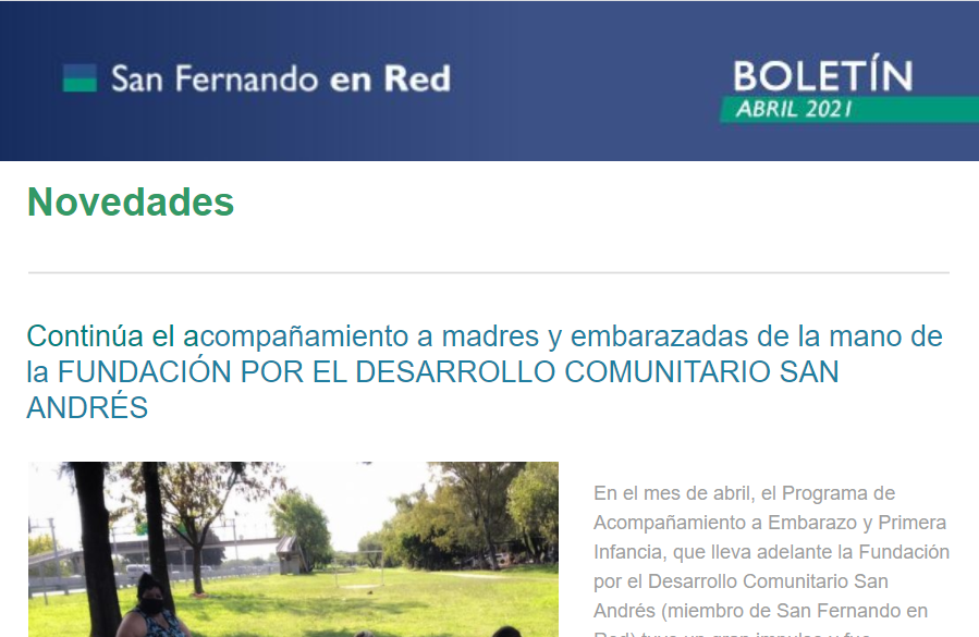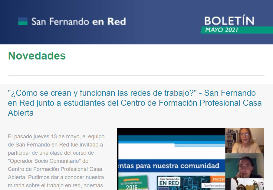 Compartimos con ustedes el Boletín Mensual de San Fernando en Red correspondiente al mes de Mayo: clickaqui Para poder enterarse de las principales noticias del mes, los invitamos a suscribirse a nuestro boletín mensual entrando a www.sanfernandoenred.org.ar Para visitar nuestra fanpage de Facebook: click aquí. Para contactarse con nosotros pueden escribirnos a redsasf@sanandres.esc.edu.ar